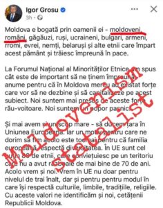 Mai mult decât atât, Igor Grosu pune în același rând cu romanii etniile conlocuitoare din Republica Moldova (ucraineni, găgăuzi, bulgari) spre a valida o altă teză a moldovenismului statalist – stat multietnic, ceea ce este la fel o scornire sovietică. În Republica Moldova sunt peste 80% români, or, în sens european doar statele unde națiunea titulară nu este majoritară pot fi considerate multietnice.